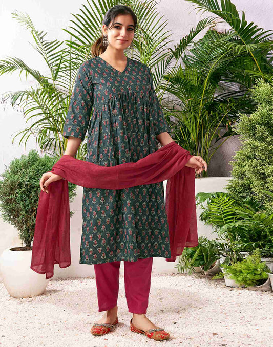 Bottle Green Cotton Printed A-Line Kurta Set With Dupatta