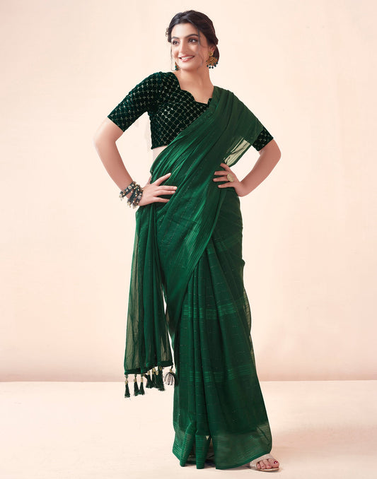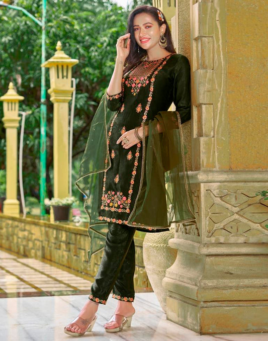 Bottle Green Embroidery Velvet Straight Kurta With Pant And Dupatta
