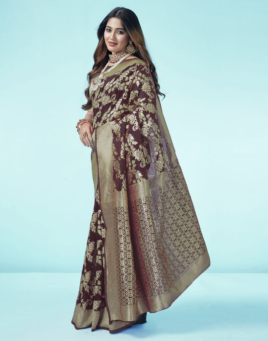 Brown Floral Banarasi Silk Saree