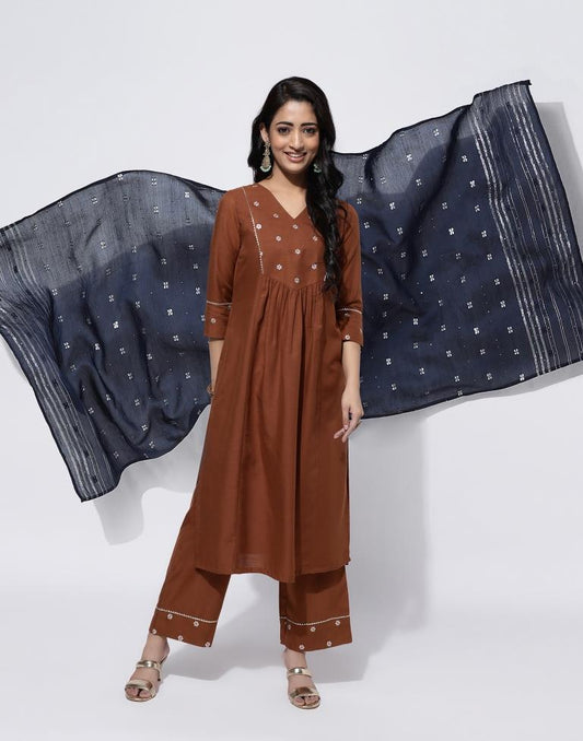 Brown Embroidery Cotton Straight Kurta With Pant And Dupatta