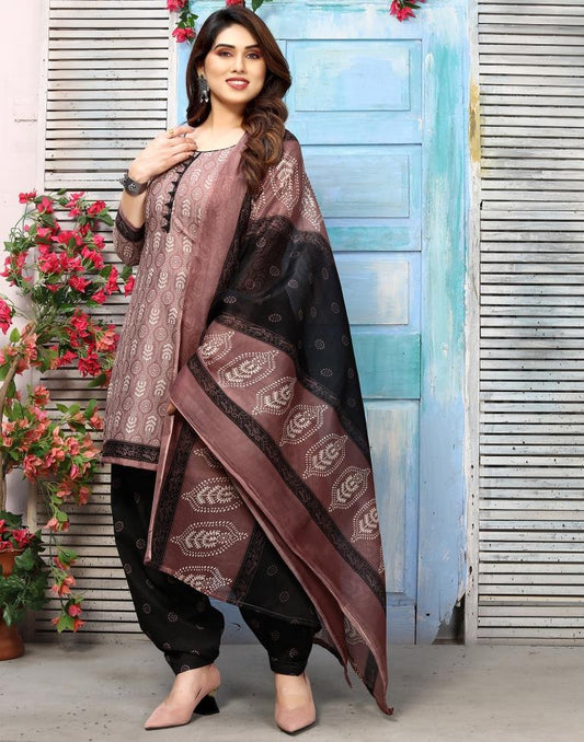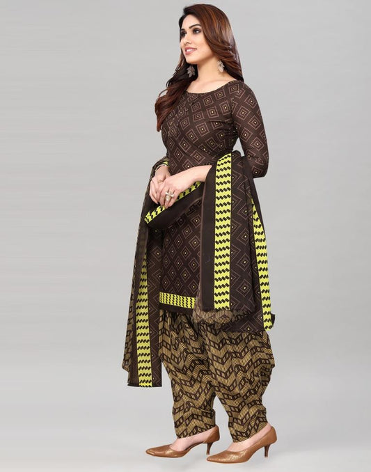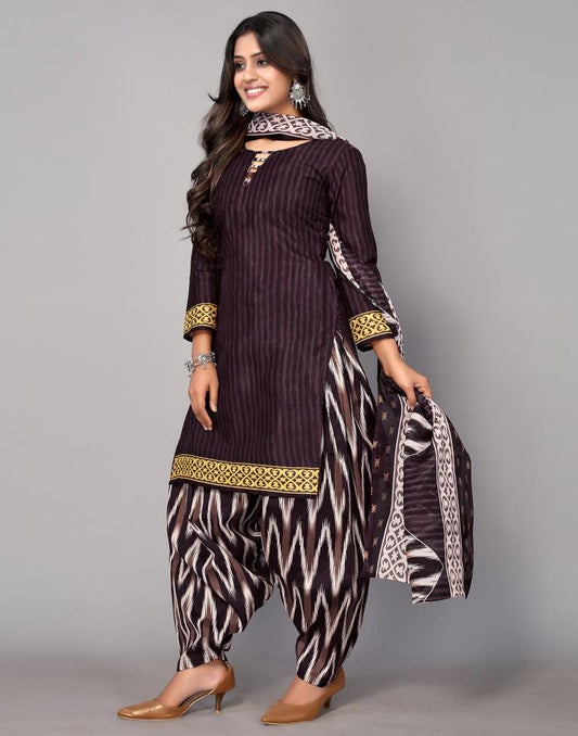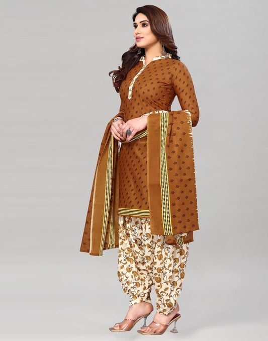 Brown Printed Cotton Unstitched Salwar Suit Material