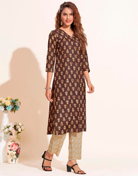 Regular price Rs. 879.00Regular priceUnit price / perRs. 0.00Sale price Rs. 879.00Brown Printed Cotton A-Line Kurta With Pant
