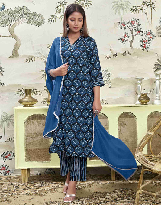 Dark Blue Printed Muslin Straight Kurta Set with Dupatta
