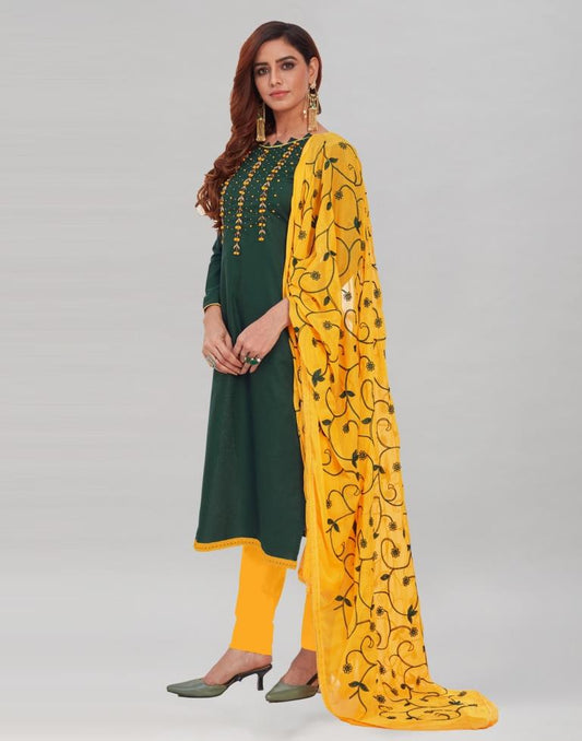 Dark Green Cotton Handwork Unstitched Salwar Suit