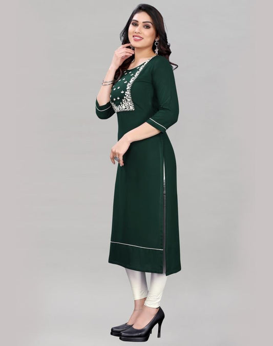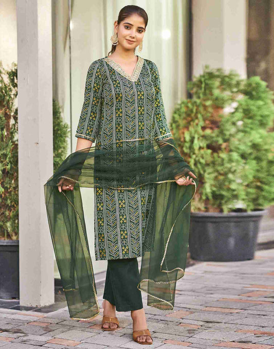 Dark Green Embroidery Chinnon Straight Kurta Set With Dupatta