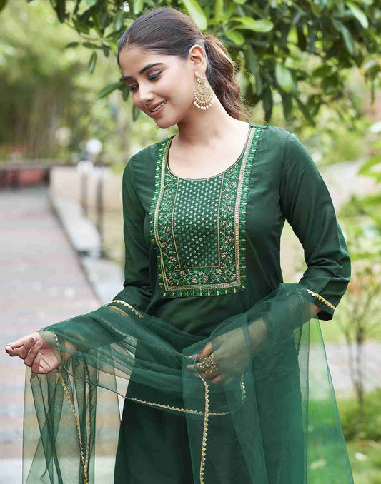 Dark Green Embroidery Silk Straight Kurta With Pant And Dupatta