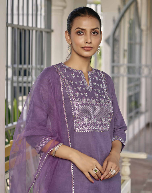 Dark Lavender Embroidery Cotton Straight Kurta With Pant And Dupatta