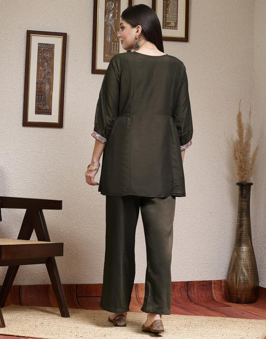 Dark Olive Green Muslin Printed Co-ord Set