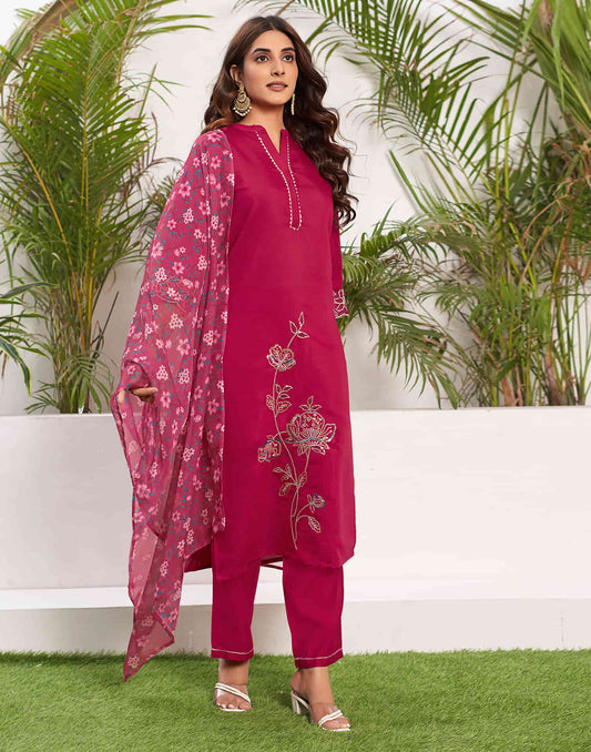 Dark Pink Sequence Silk Straight Kurta With Pant And Dupatta