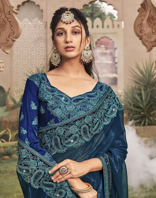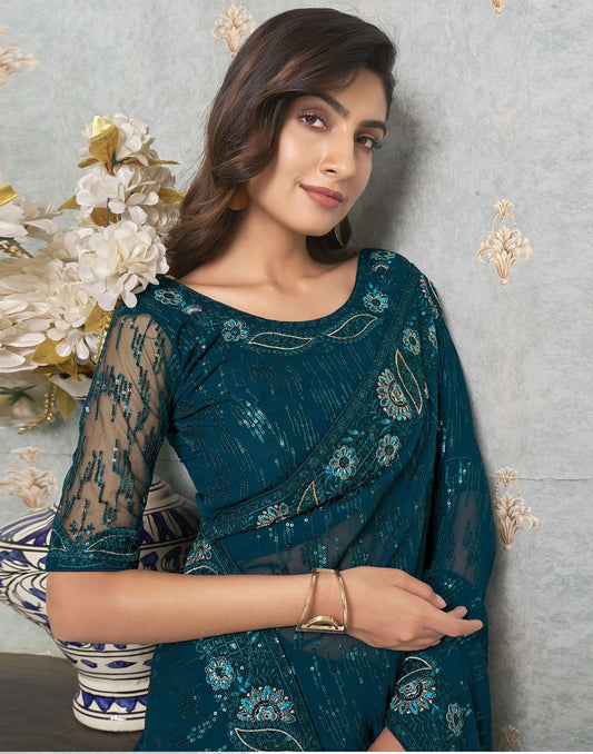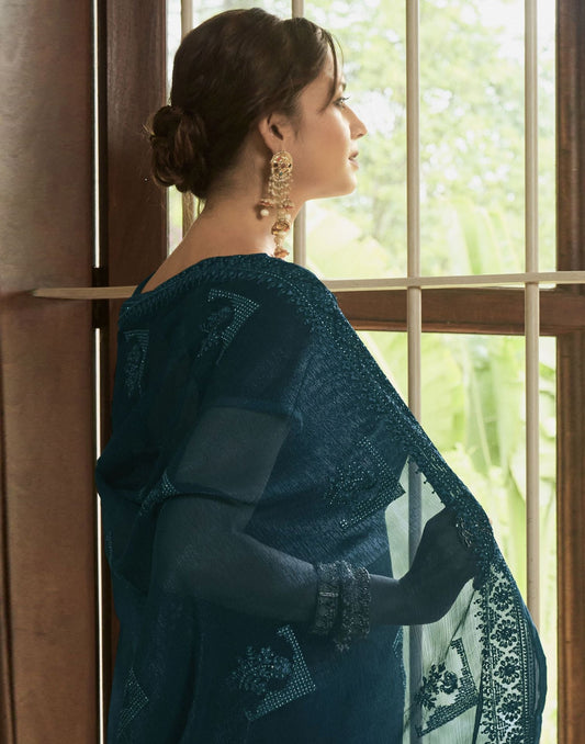 Dark Teal Heavy Chiffon Printed Wth Sequence Saree