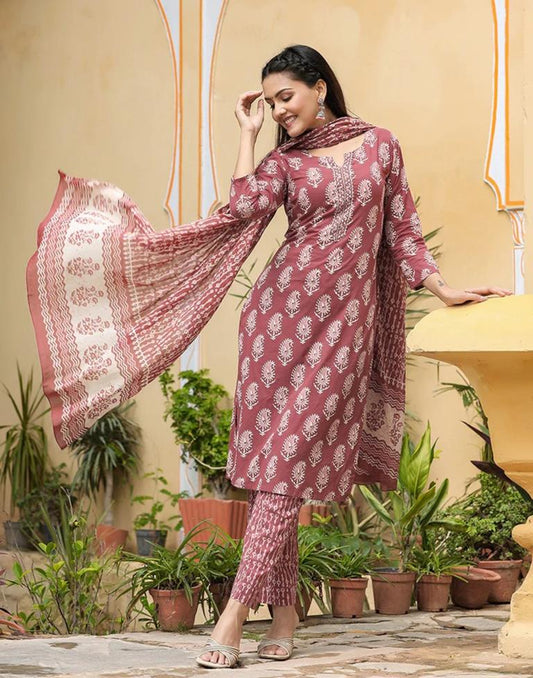 Dusty Pink Printed Rayon Straight Kurta With Pant And Dupatta