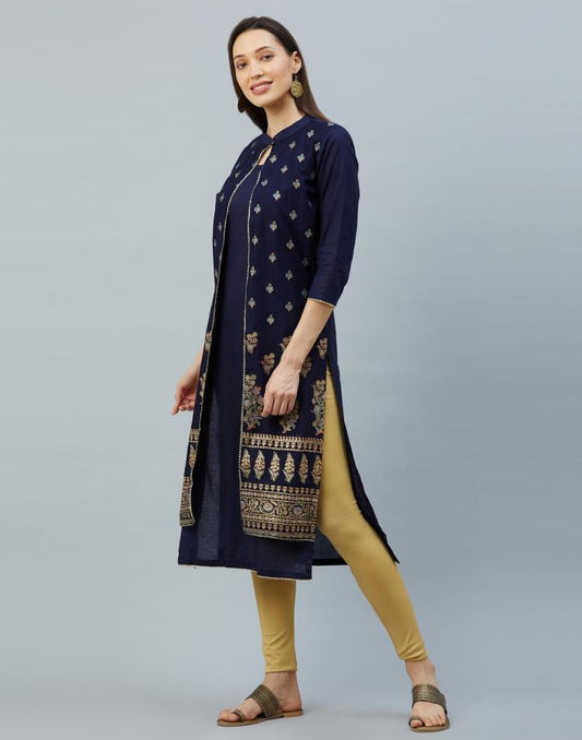 Enticing Navy Blue Coloured Digital & Foil Printed Cotton Kurti