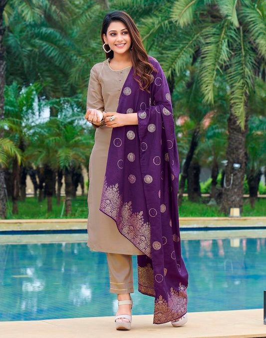 Beige Plain Silk Straight Kurta With Pant And Dupatta