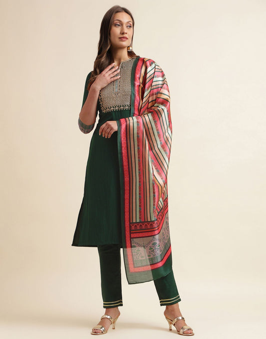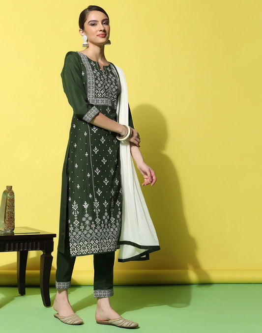 Green Chinnon Embroidery Straight Kurti With Pant And Dupatta
