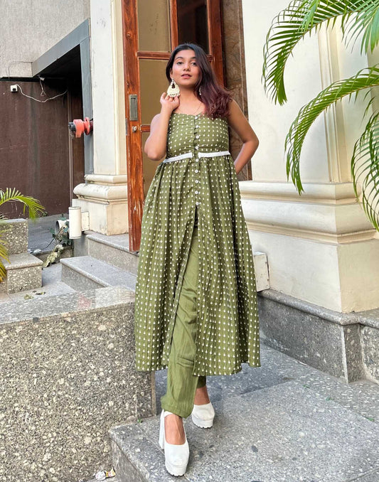 Regular price Rs. 1,079.00Regular priceUnit price / perRs. 0.00Sale price Rs. 1,079.00Green Khadi printed Kurti with Pant And Dupatta