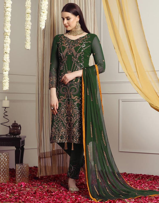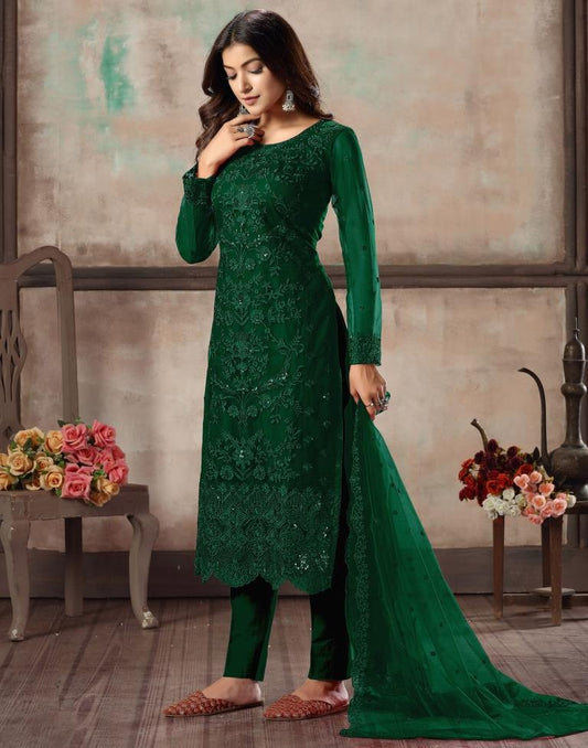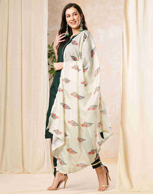 Green Plain Chinnon Straight Kurta With Pant And Dupatta