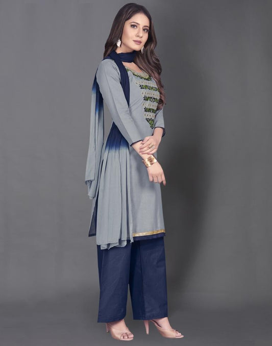 Grey Cotton Embroidered Unstitched Salwar Suit
