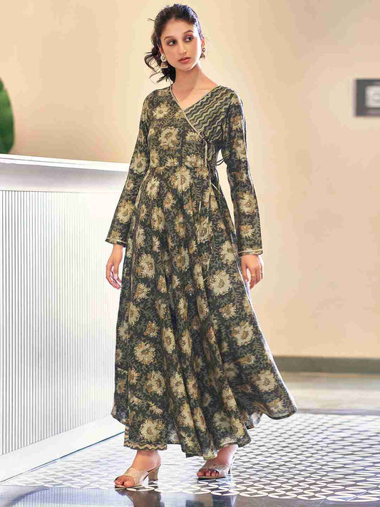 Regular price Rs. 1,789.00Regular priceUnit price / perRs. 0.00Sale price Rs. 1,789.00Grey Printed Chanderi Flaired Kurta With Pant And Dupatta