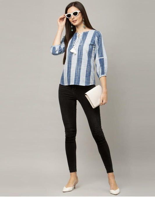 Bewitching Blue Coloured Woven Striped Cotton Tops