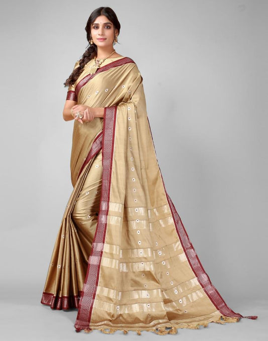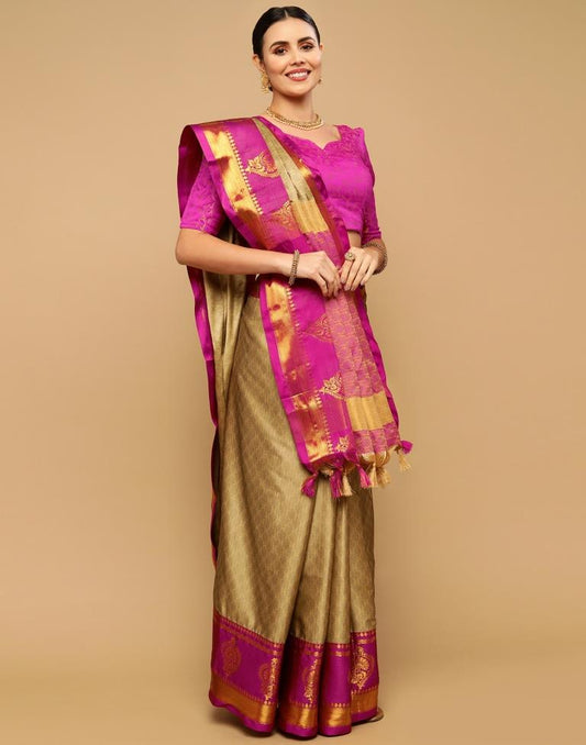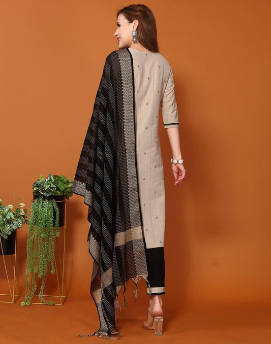 Beige Woven Chinnon A-Line Kurta With Pant And Dupatta