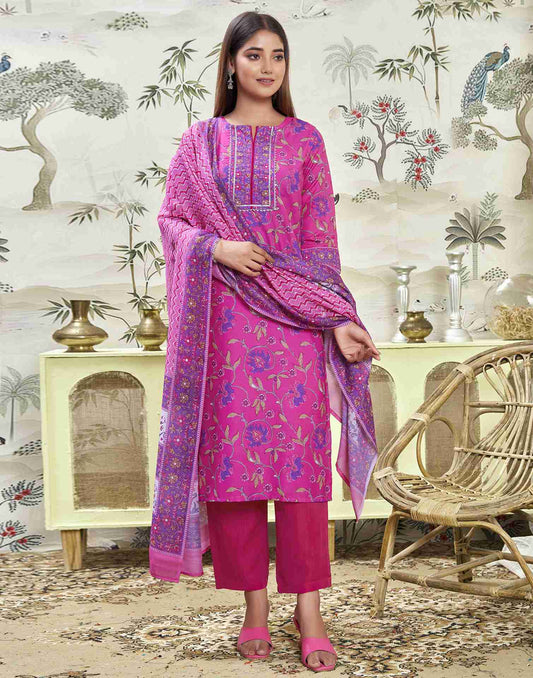 Hot Pink Printed Rayon A-Line Kurta Set With Dupatta