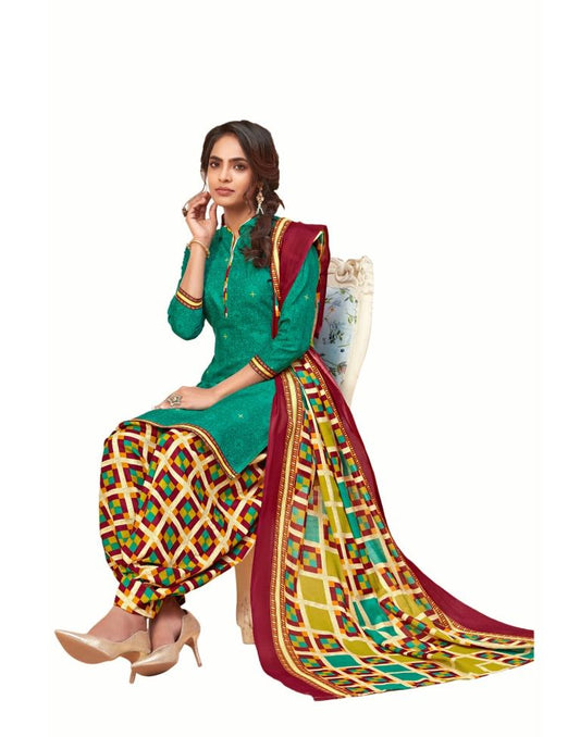 Idyiic Turquoise Green Cotton Printed Unstitched Salwar Suit