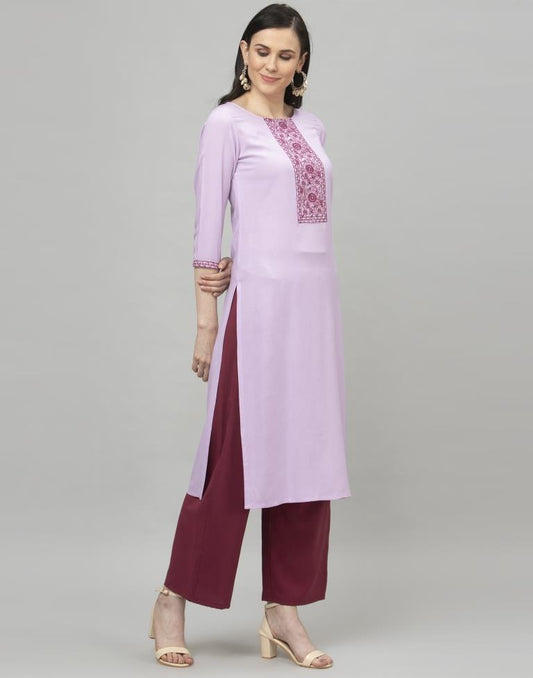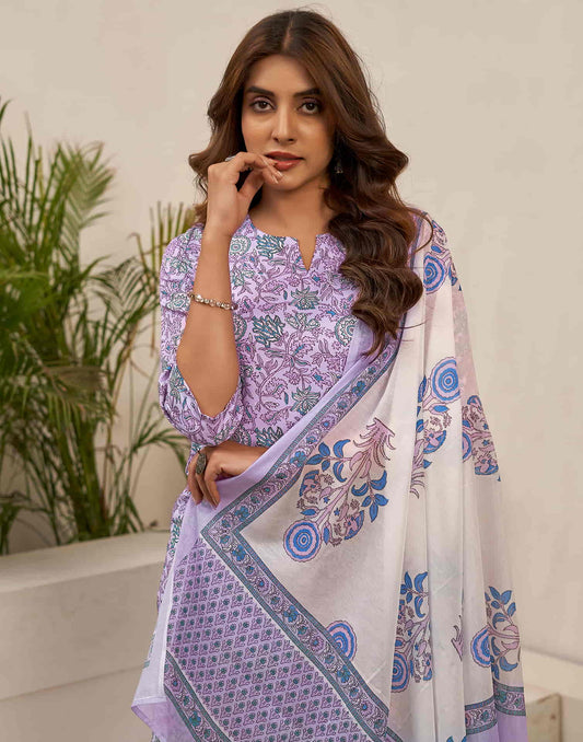 Lavender Printed Rayon Straight Kurta With Pant And Dupatta