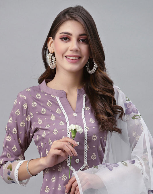 Lavender Printed Rayon Straight Kurta Set with Dupatta