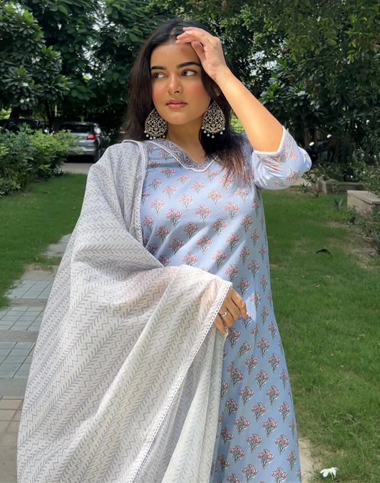 Regular price Rs. 1,139.00Regular priceUnit price / perRs. 0.00Sale price Rs. 1,139.00Light Blue Cotton Printed Straight Kurta With Pant And Dupatta