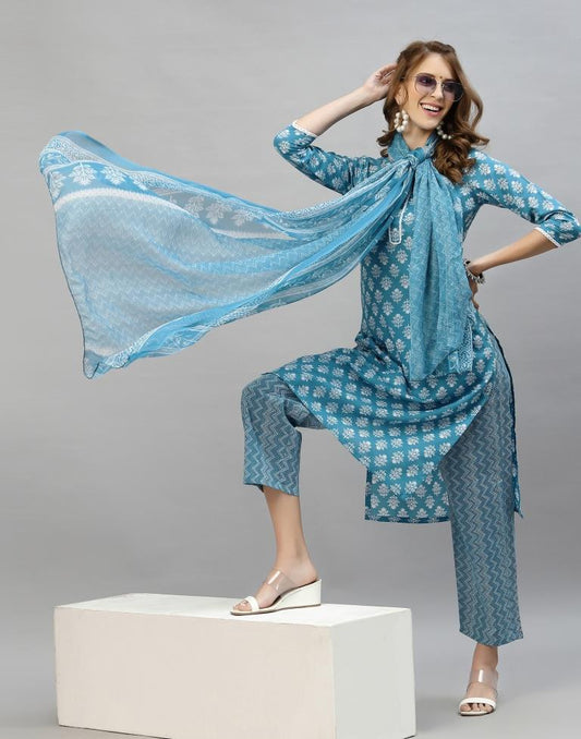 Regular price Rs. 1,129.00Regular priceUnit price / perRs. 0.00Sale price Rs. 1,129.00Light Blue Printed Cotton Straight Kurta With Pant And Dupatta