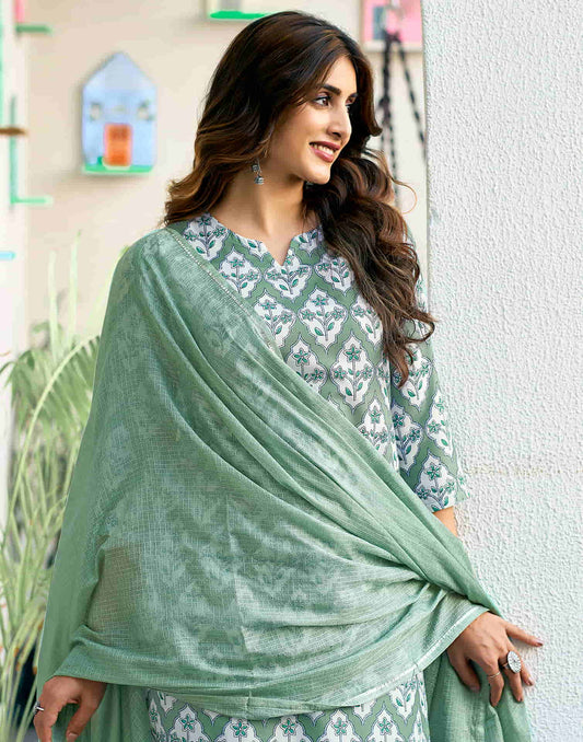 Light Dusty Green Printed Rayon Straight Kurta With Pant And Dupatta