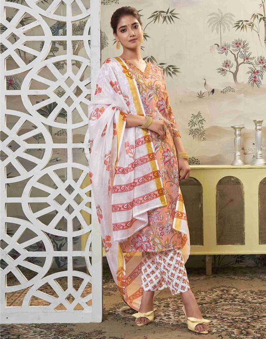 Light Peach Printed Rayon Straight Kurta Set With Dupatta