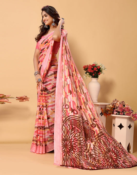 Light Pink And Navy Blue Cotton Silk Geometric Saree