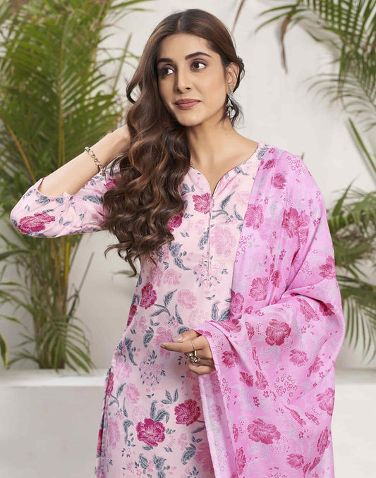 Light Pink Printed Rayon A-Line Kurta With Pant And Dupatta