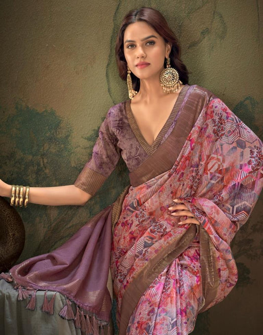 Light Pink Printed Organza Saree