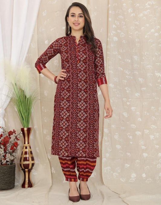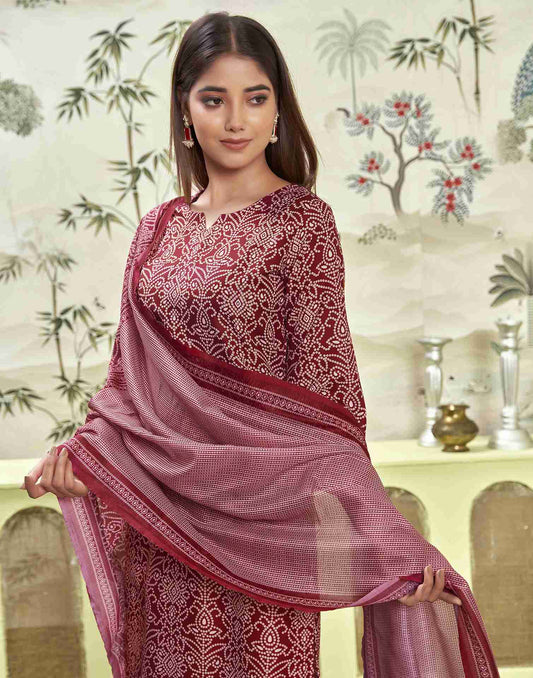 Maroon Printed Rayon A-Line Kurta With Pant And Dupatta