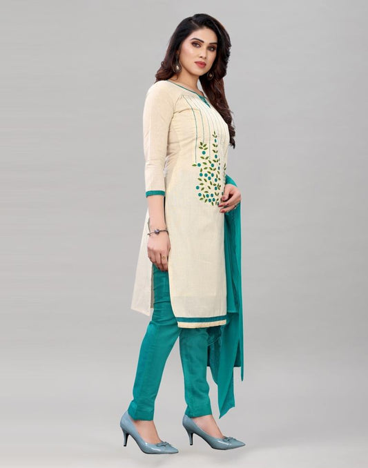 Mesmerising Off White Cotton Embroidered Unstitched Salwar Suit