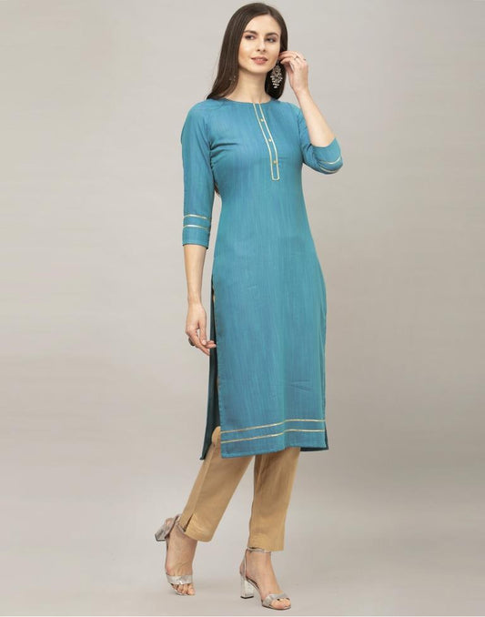 Mesmerising Teal Blue Coloured Dyed, Laced Rayon Kurti