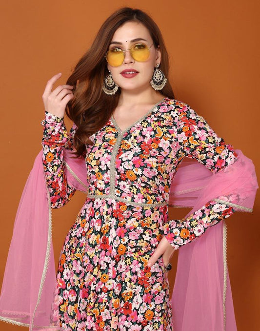 Multicoloured Printed Flared Kurta Kurti With Pant And Dupatta