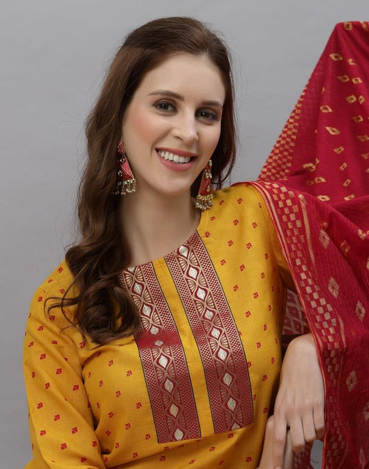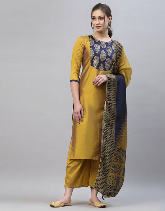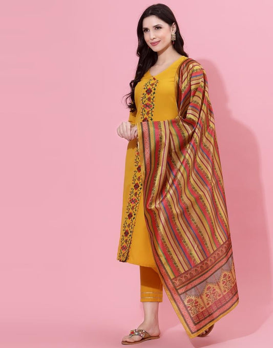 Mustard Embroidery Silk Straight Kurta With Pant And Dupatta