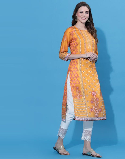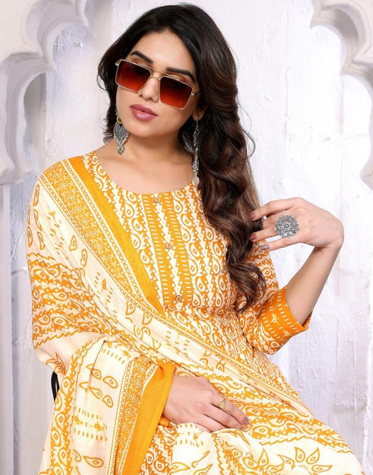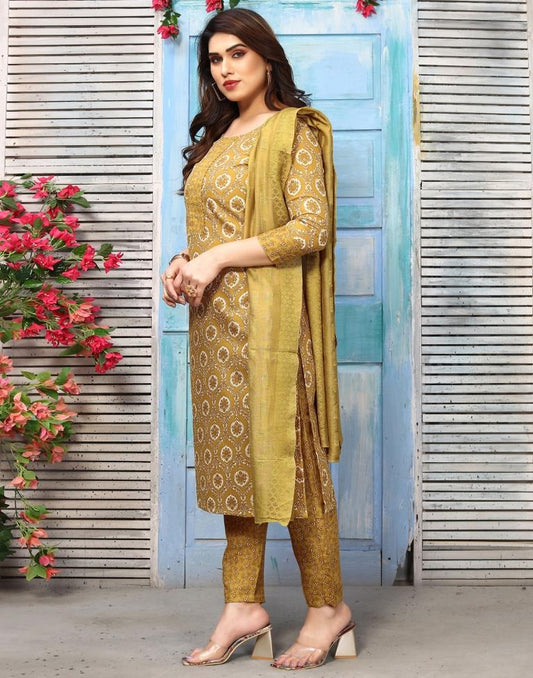Mustard Printed Rayon Straight Kurta With Pant And Dupatta