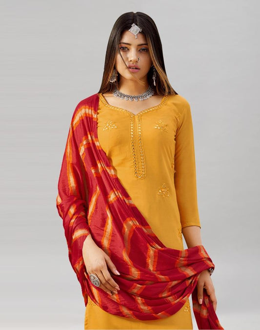 Mustard Yellow Cotton Embroidered Unstitched Salwar Suit
