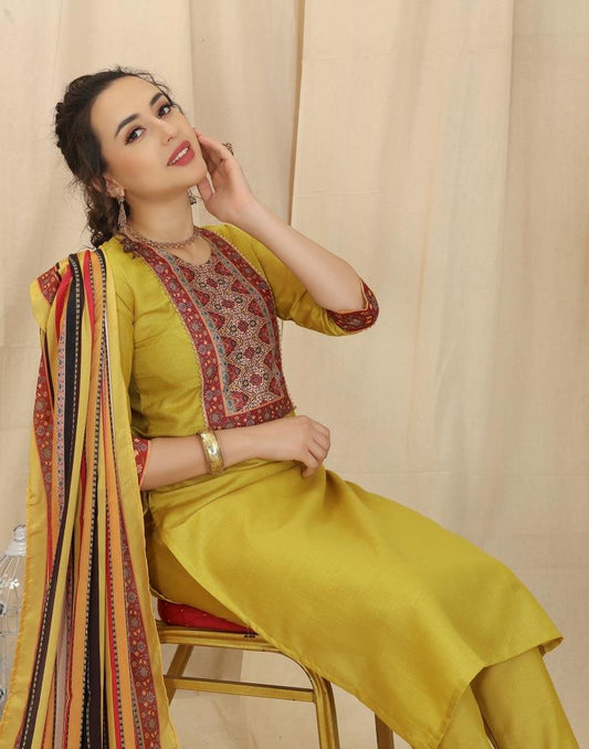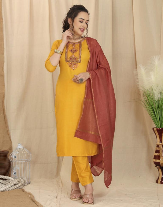 Mustard Yellow Cotton Embroidery Straight Kurta With Pant And Dupatta