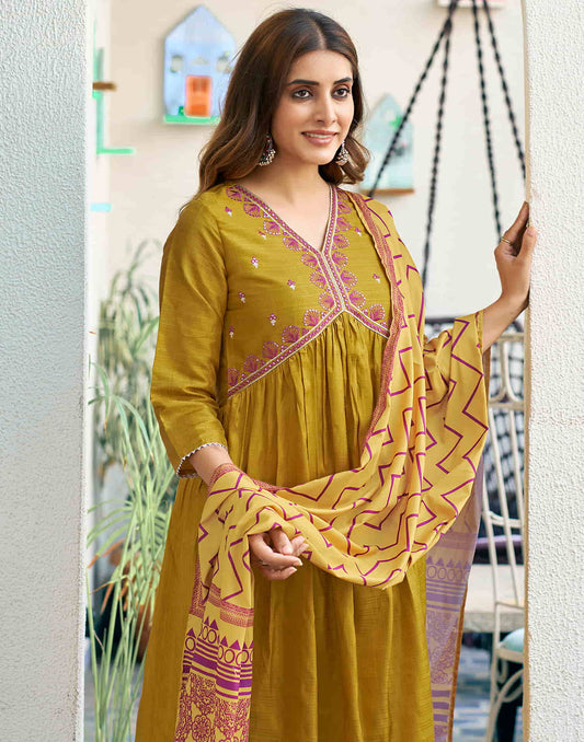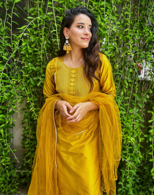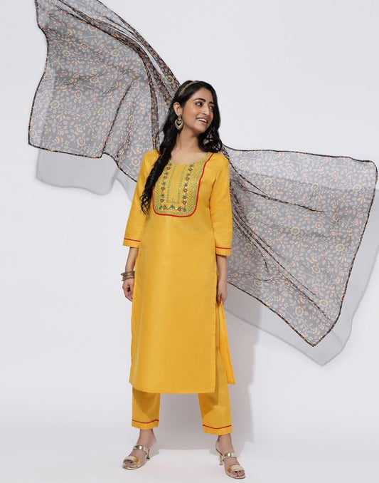 Mustard Yellow Silk Embroidery Straight Kurta Set With Dupatta