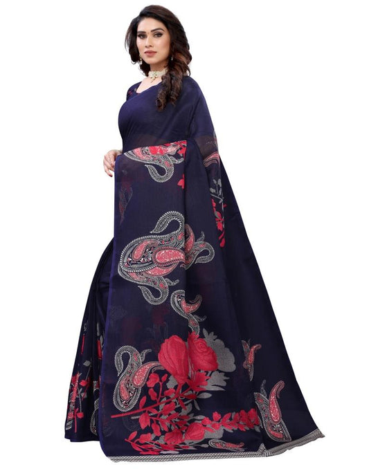 Navy Blue Coloured Poly Jute Floral Printed Casual saree