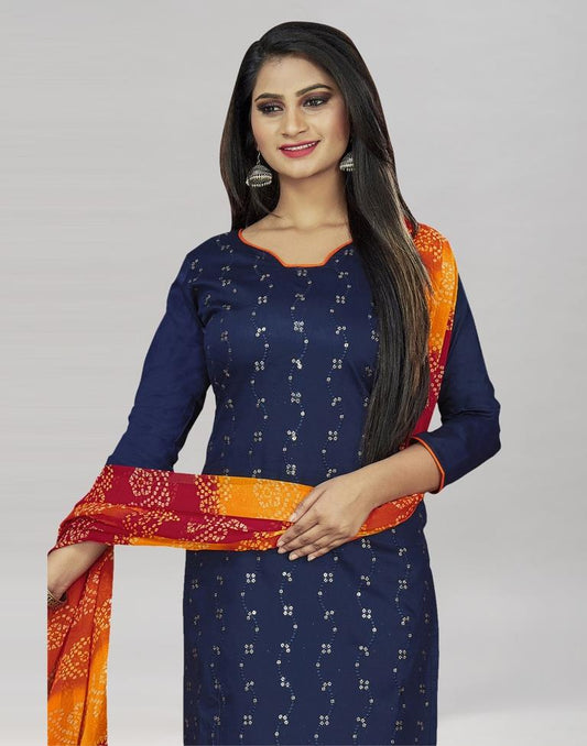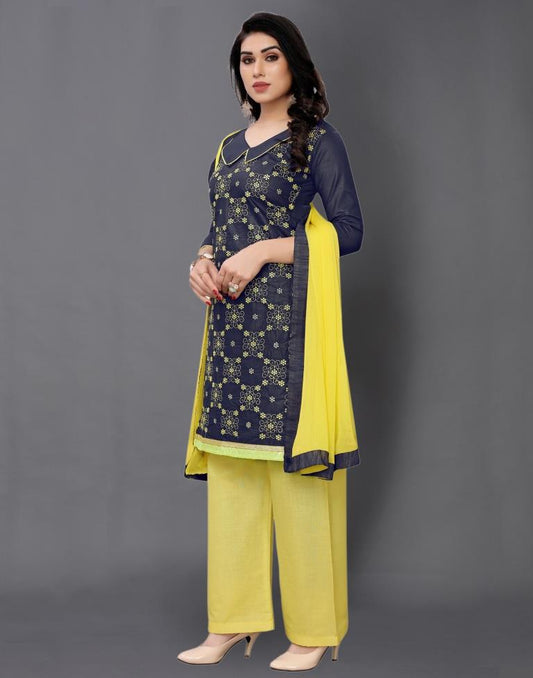 Navy Blue Cotton Embroidered Unstitched Salwar Suit