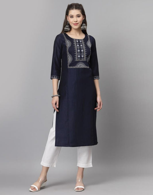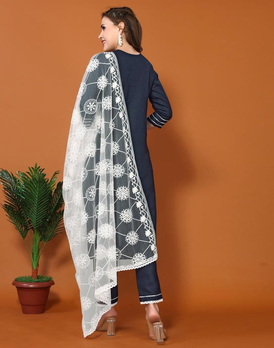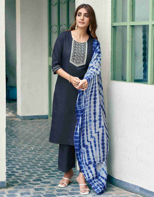 Navy Blue Embroidery Cotton Straight kurta With Pant And Dupatta