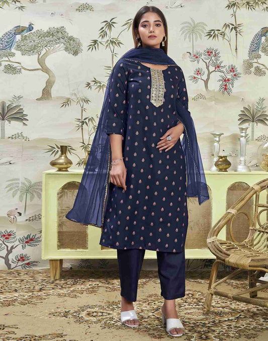 Navy Blue Embroidery Chinnon Straight kurta With Pant And Dupatta