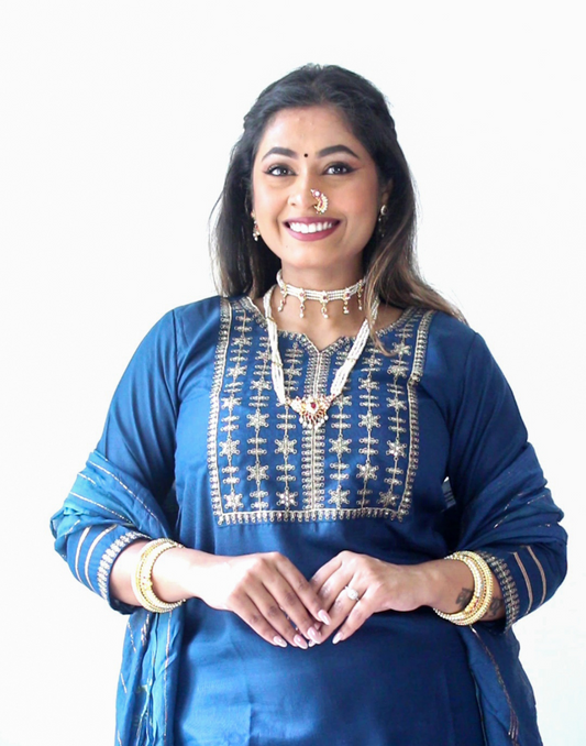 Navy Blue Embroidery Straight Kurti With Pant And Dupatta