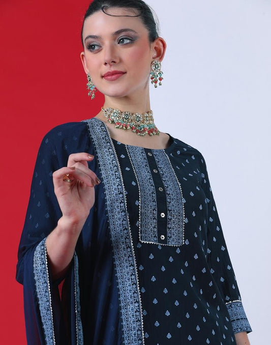 Navy Blue Printed Chinnon Straight Kurta With Pant And Dupatta